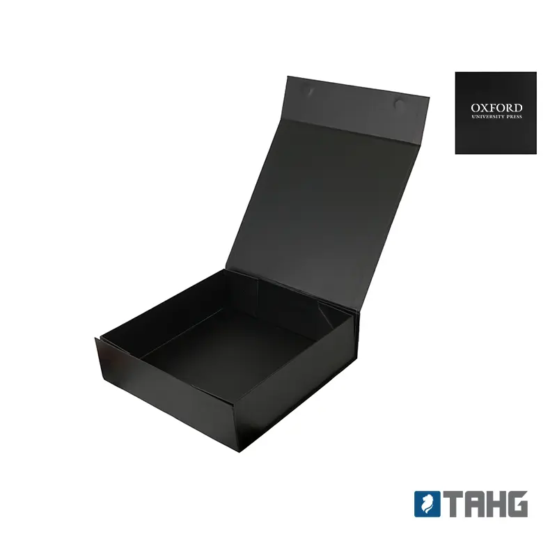 Caja plegable de cartón laminado mate en color negro, fabricada con materiales resistentes y diseño estructural reforzado. Cuenta con cierre magnético, esquinas con cinta adhesiva doble faz transparente para poder armarla y diseño plano que permite fácil almacenamiento y armado. Es ideal para presentaciones de productos, embalaje premium o uso como contenedor organizador en oficinas o eventos. Tahg