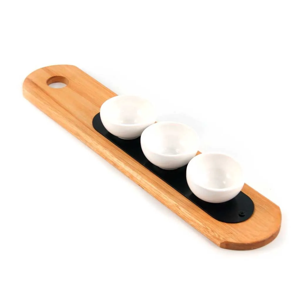 Material: Madera leuca compensada y cerámica esmaltada. Medidas: 50cm. X 10cm. X 1cm. La madera está curada e impermeabilizada con oleo vegetal. Elementos (4 Piezas): 1 Tabla baguette de madera y 3 cuencos de cerámica esmaltada redondos.