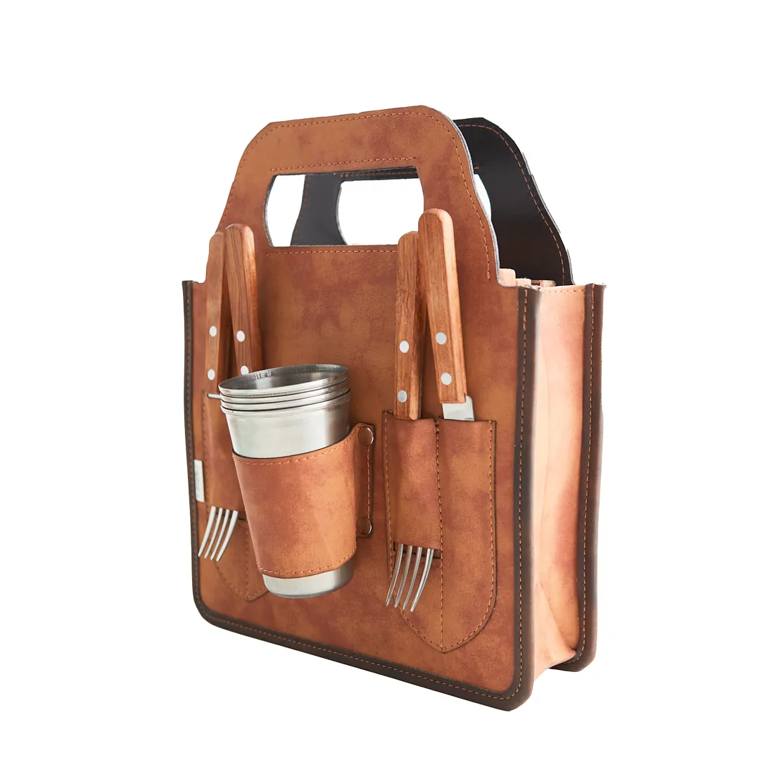 Estuche de ecocuero. Con costura reforzada. 4 Platos cuadrados de madera de Leuka con canal para goteo. 4 Juegos de cubiertos acero inoxidable con mango de madera t./Tramontina. 4 Vasos de acero inoxidable.