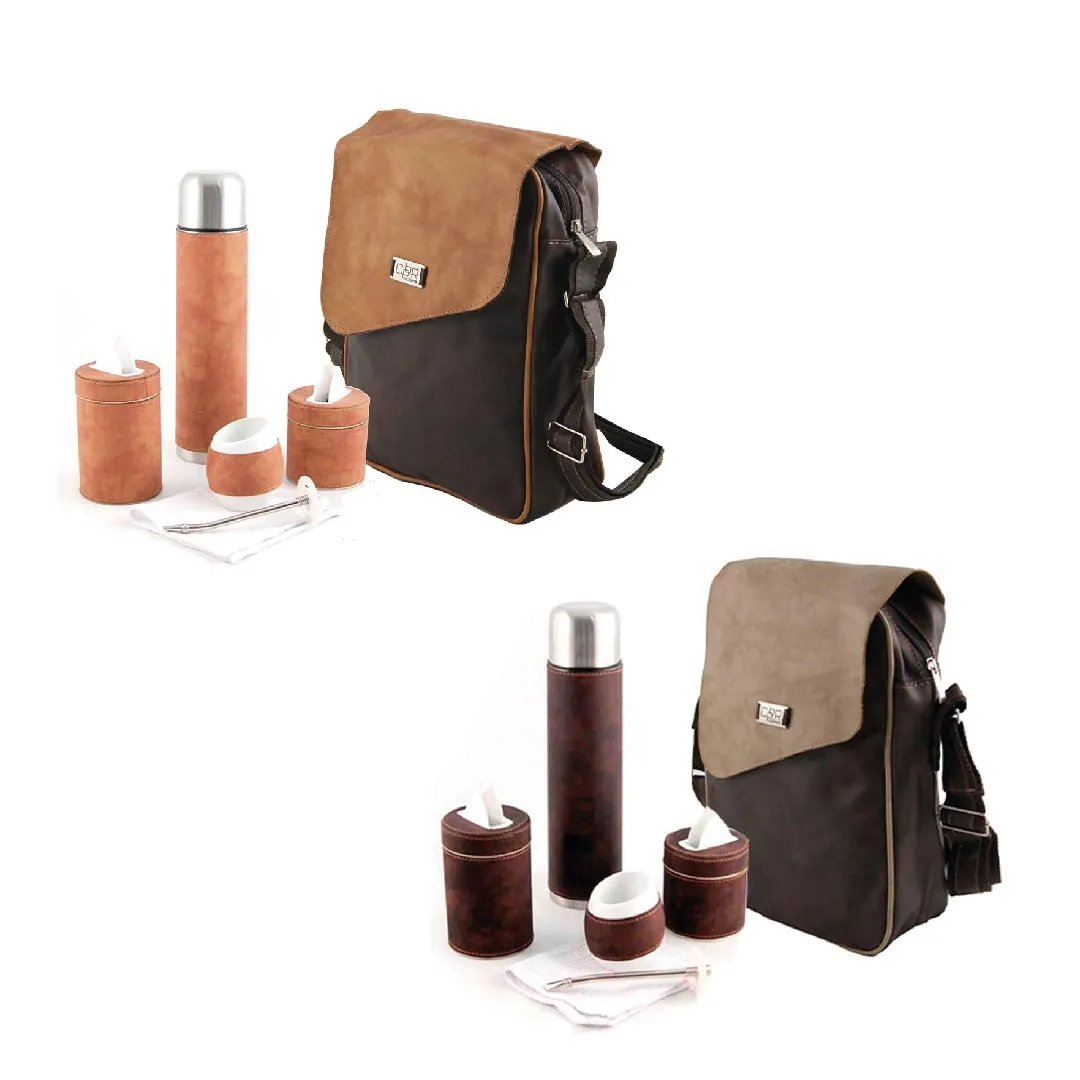Termo acero inoxidable de 1 litro. Forrado en ecocuero. Costura reforzada. Lata para yerba de 12 cm con pico vertedor. Lata para azúcar de 8 cm con pico vertedor. Mate acriselfie térmico con banda forrada en ecocuero. Bombilla de metal con extractor de yerba. Detalle en silicona. Servilleta de tela.