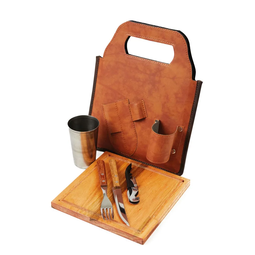 Estuche de ecocuero con: Plato cuadrado de madera de Leuka con canaleta, juego de cubiertos acero inoxidable con mango de madera t./Tramontina, 1 vaso de acero inoxidable y 1 destapador de níquel Capibara o de 2 tramos.