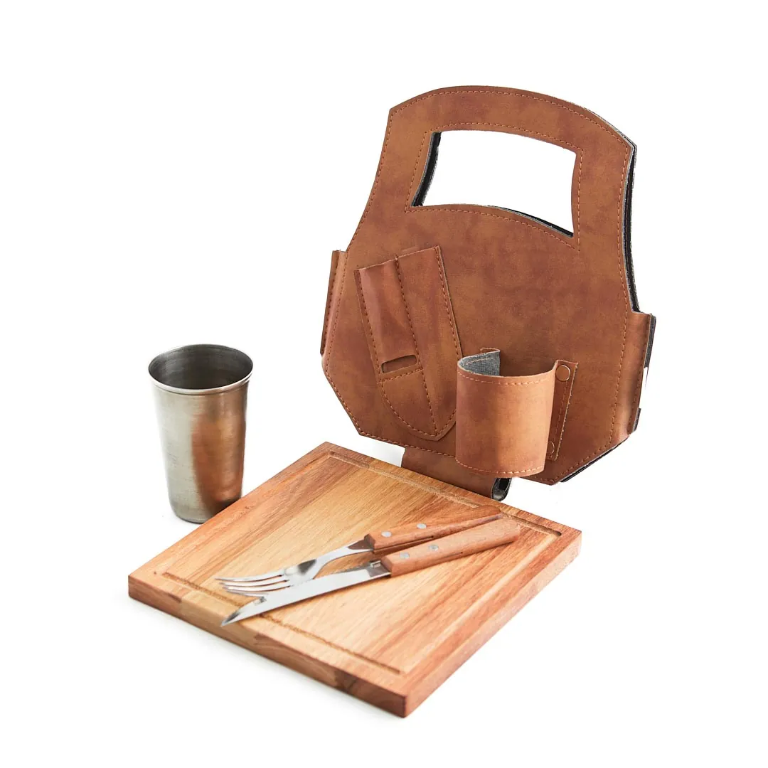 Estuche de ecocuero tricapa. Costura reforzada. Plato cuadrado de madera con canal para goteo. Juego de cubiertos acero inoxidable con mango de madera t./Tramontina. Vaso de acero inoxidable.