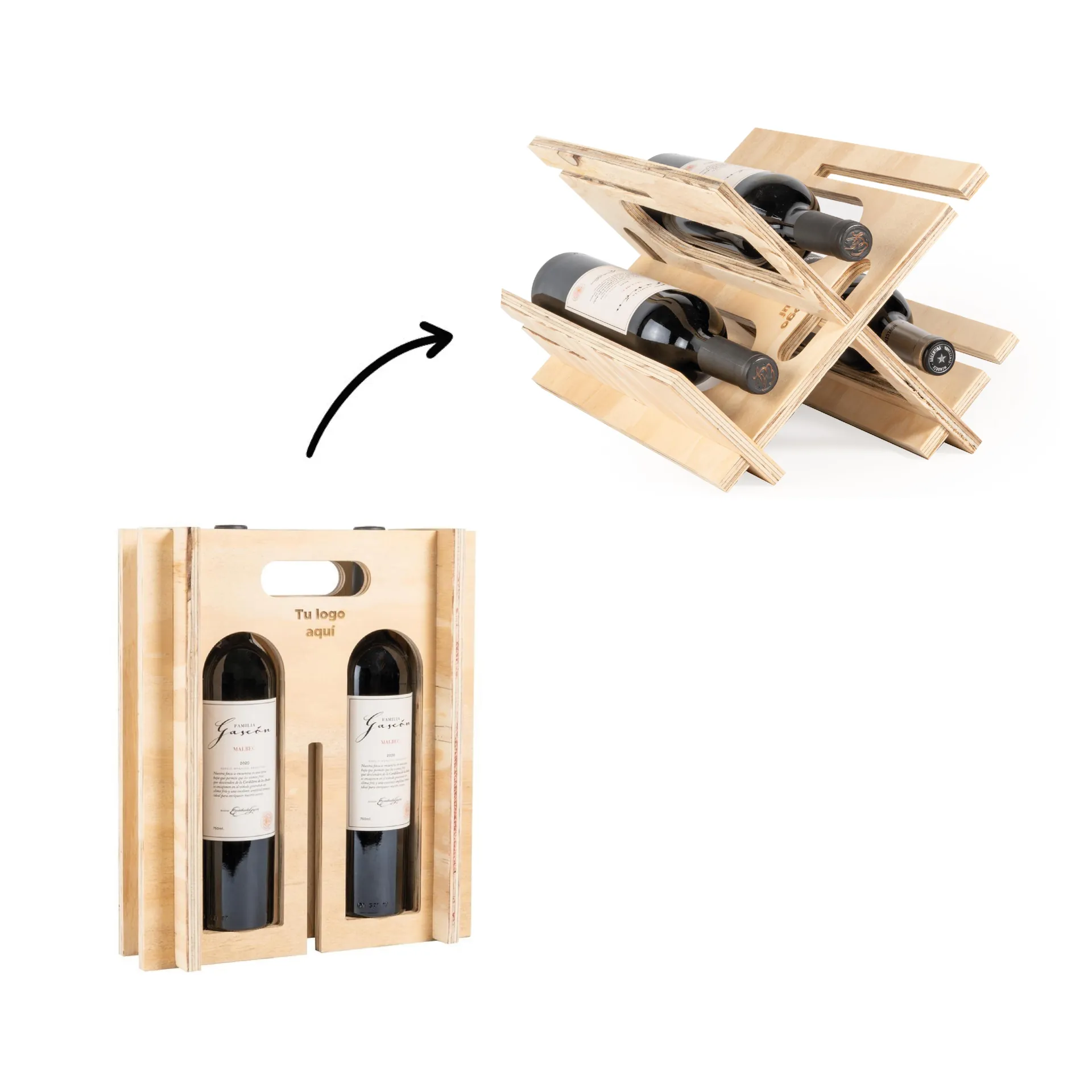 Este innovador packaging de madera, permite transportar dos botellas de vinos y luego al desarmarse puede convertirse en una vinoteca para tres vinos. Fabricada en fenolico de 12mm. Para fabricarla a medida de la botella necesitaremos que nos indique las medidas y curvaturas de la misma. No incluye los vinos.