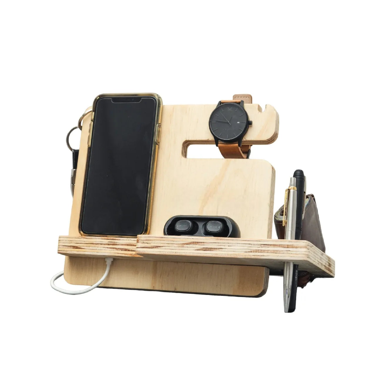 Organizador de objetos de 30x20x15 cm elabborado en fenolico de 18mm de espesor. Funcionalidades: -Ranura para colgar objetos -Apoya celular - Desbaste para objetos pequeños - Agujeros para lapices y lapiceras -Soporte para relojes -Ranura para billetera