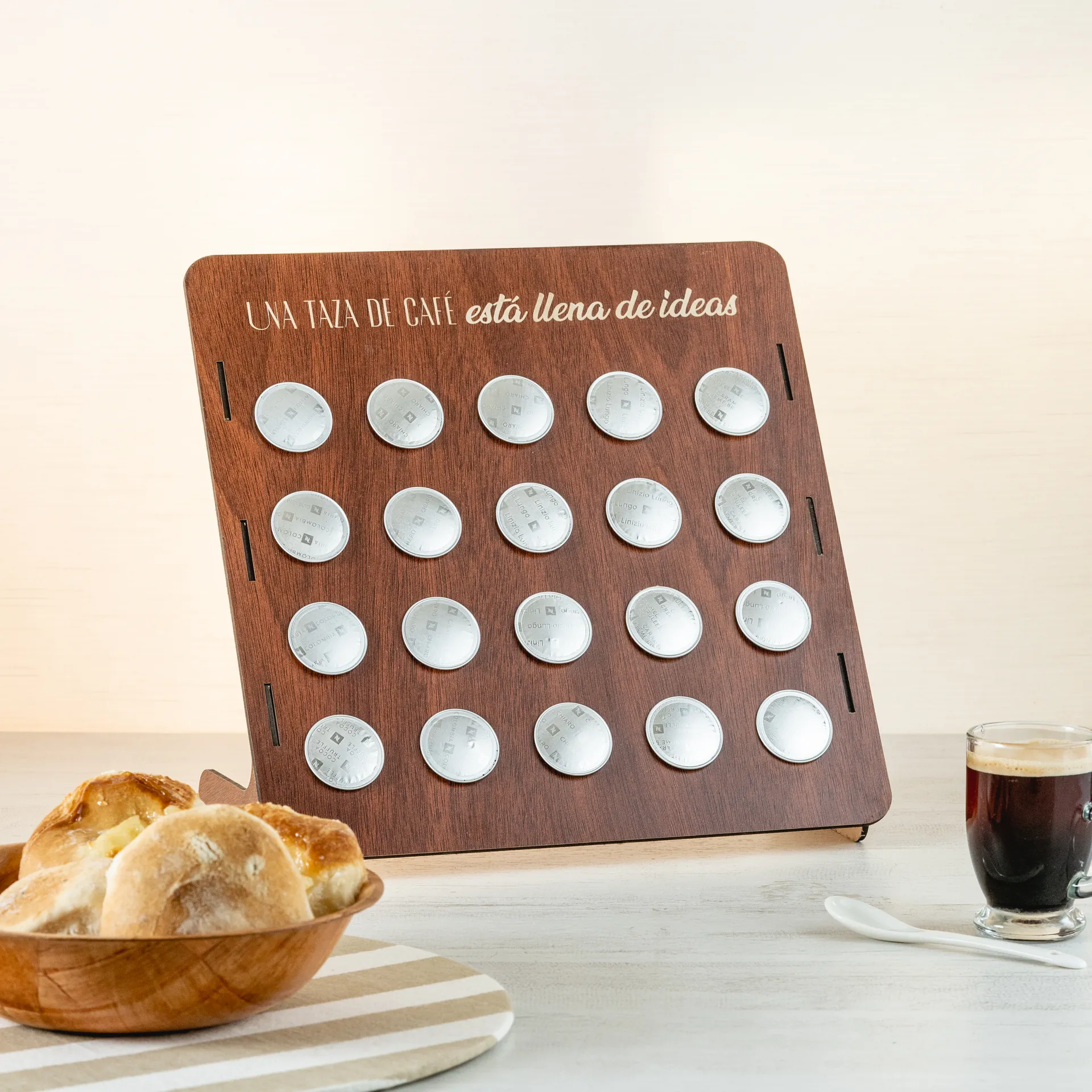 Porta capsulas para mesada de 30 x 30 cm con profundidad de 15cm, elaborado en madera fibroplus de 3mm. Color y frase a eleccion. NO incluye las capsulas de cafe. Capacidad maxima: 20 capsulas. Este producto esta elaborado unicamente para capsulas Nespresso.