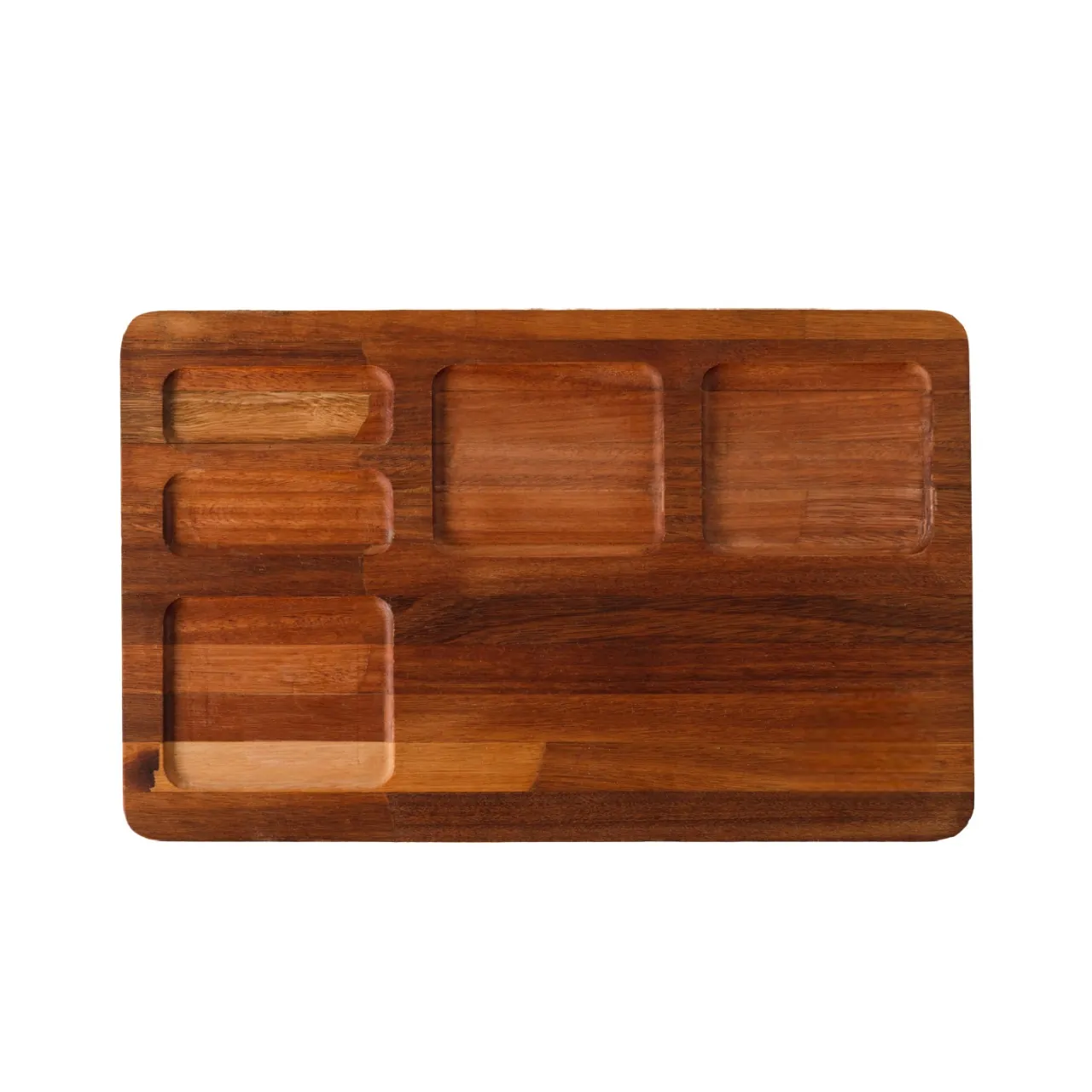 Tabla de Eucalipto de 20 mm de espesor de 40x24 cm. 5 cuencos para picadas. Encerado natural.
