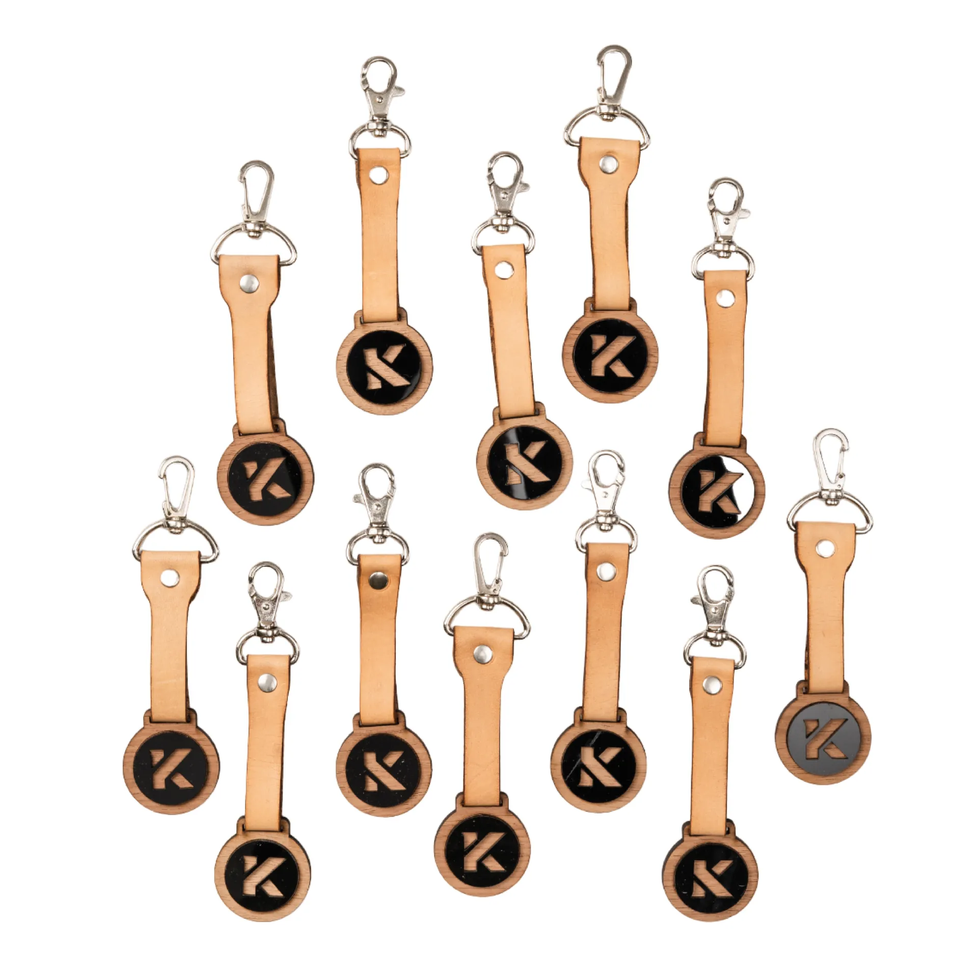 Llavero de 11 x 4 cm, elaborado en mdf enchapado y acrilico negro. Con tira de cuero suela y mosqueton.