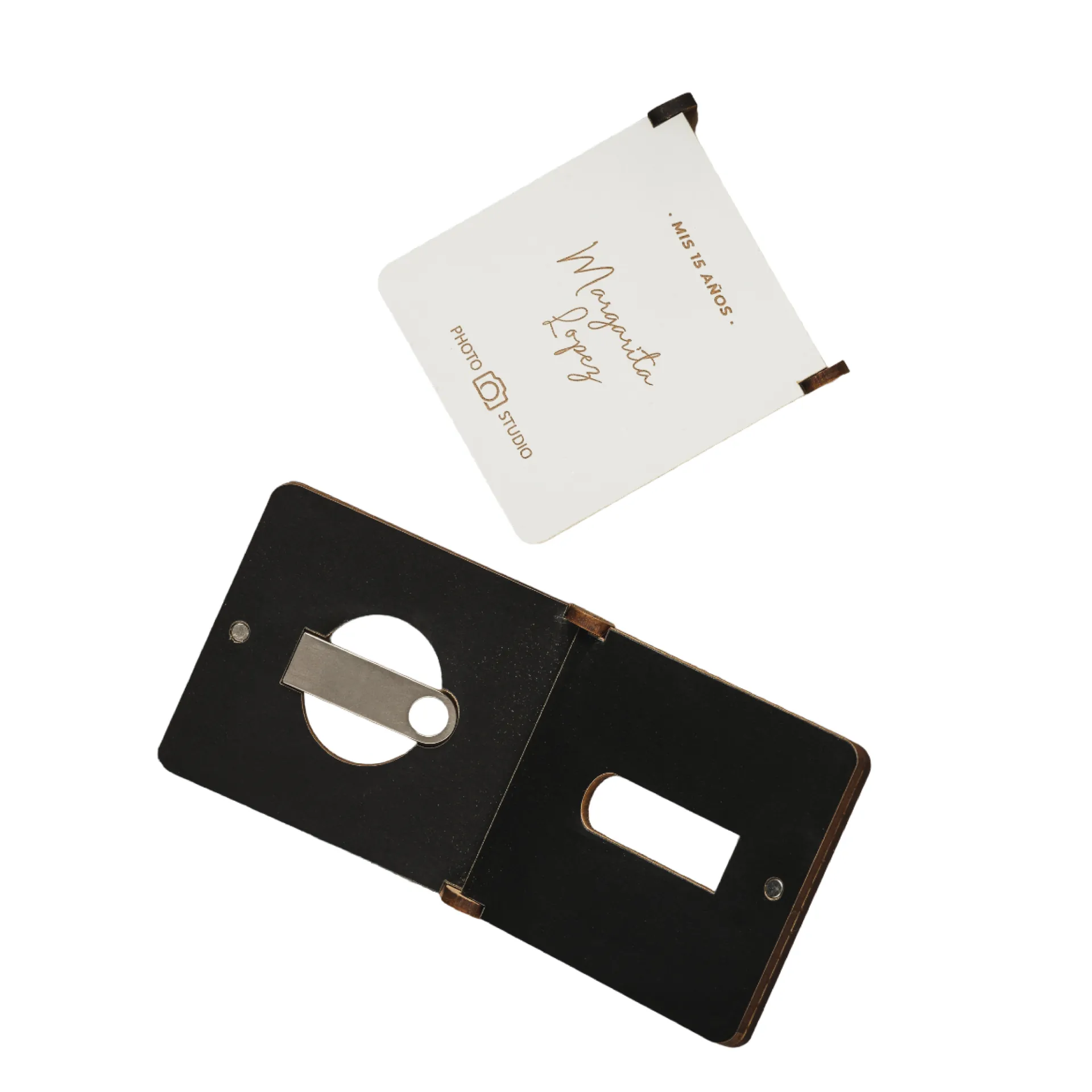 Porta pendrive realizado en fibroplus (blanco o negro). Cierre imantado para mayor seguridad. Apto para pendrives con espesor de hasta 6mm. Medida cerrado: 7x7,7 cm.