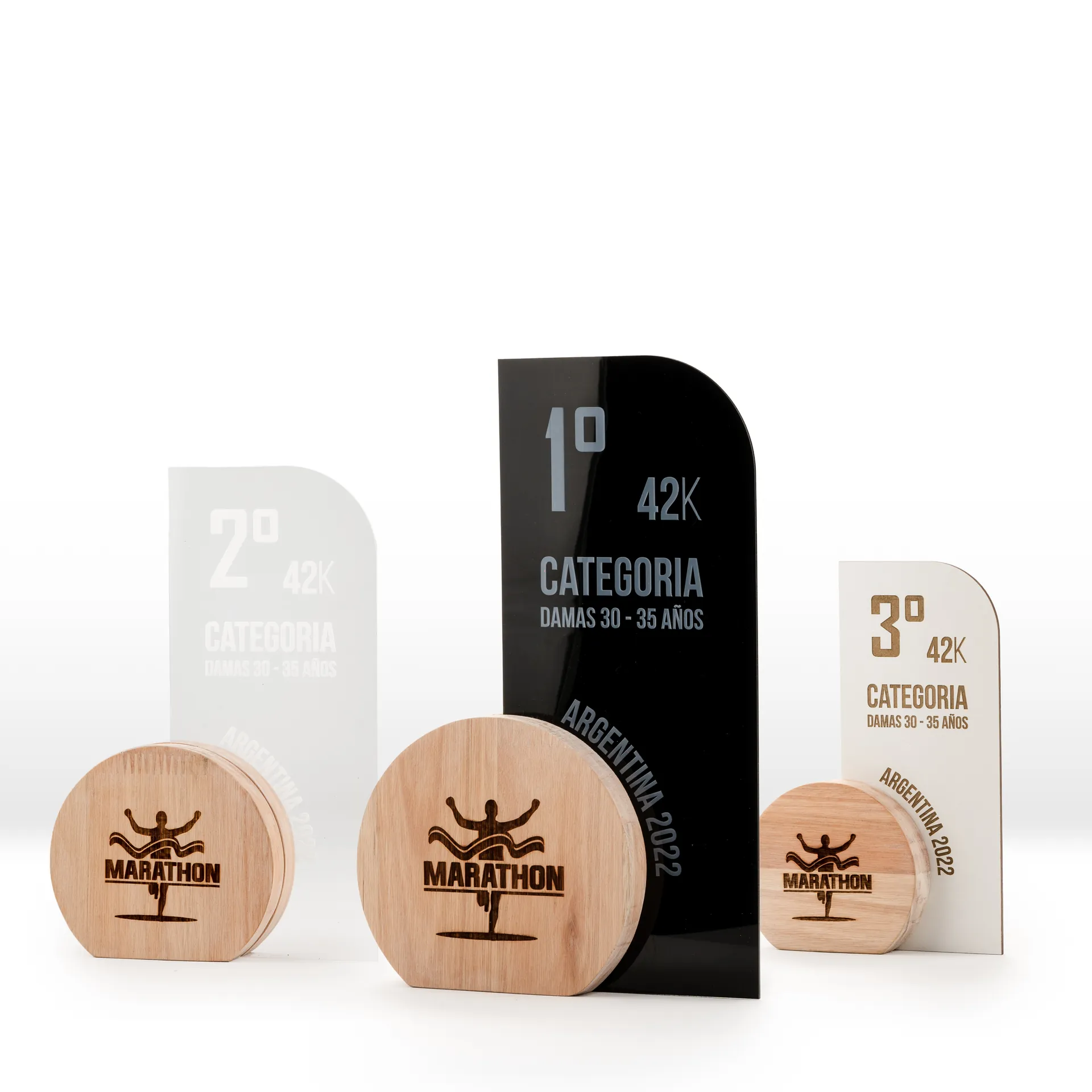 Primer puesto: 20x30 cm, realizado en acrílico negro. Segundo puesto: 16x24,5 cm, realizado en acrílico transparente. Tercer puesto: 13x19,5 cm, realizado en fibroplus blanco. Una vez Efectuada la compra se coordina el diseño que va grabado