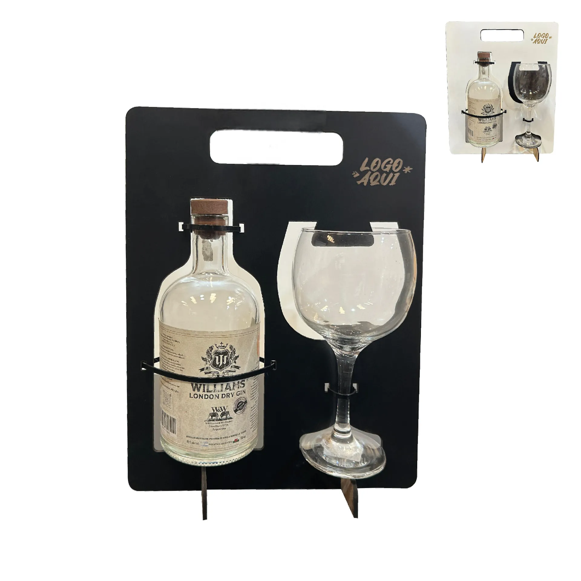 Soporte para una copon de 615 ml y una botella Gin. Realizada en fibroplus de 3 mm de espesor. Color: negro o blanco. Medidas: 26x36 cm. No incluye botella de gin.