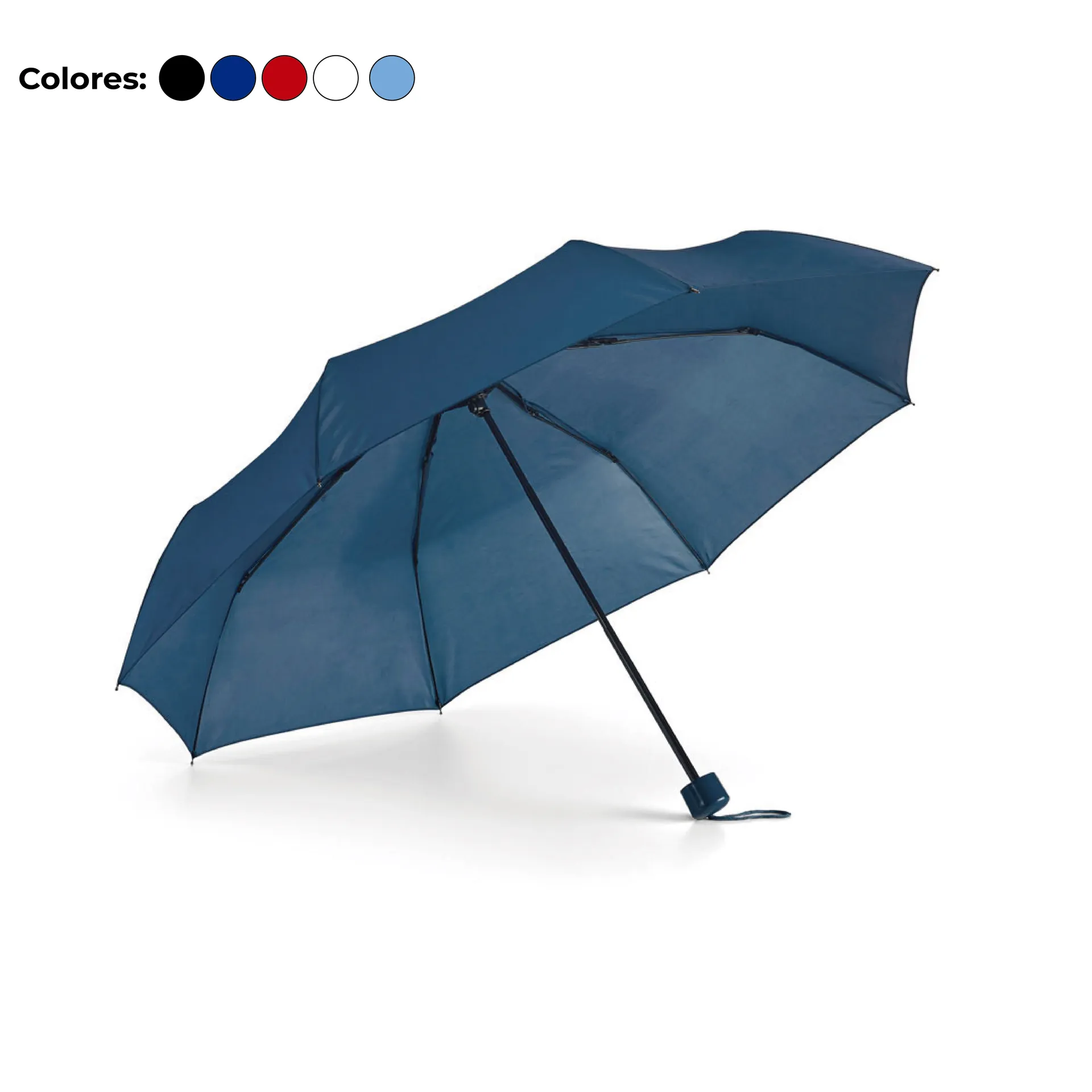 Paraguas plegable tamaño perfecto para llevar siempre. Diseño y tamaño ideal para transportar, posee correa para colgar, mango de plástico de color. Incluye funda mismo color. De 8 gajos de estructura en 3 partes metálica, botón de bloqueo, apertura manual. Poliéster 190T.