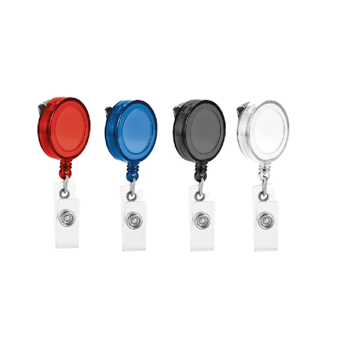 Cuerpo translúcido, con clip metálico y mecanismo extensible hasta 90 cm. Viene con clip transparente y botón para añadir tarjeta. ø32 x 9 mm
