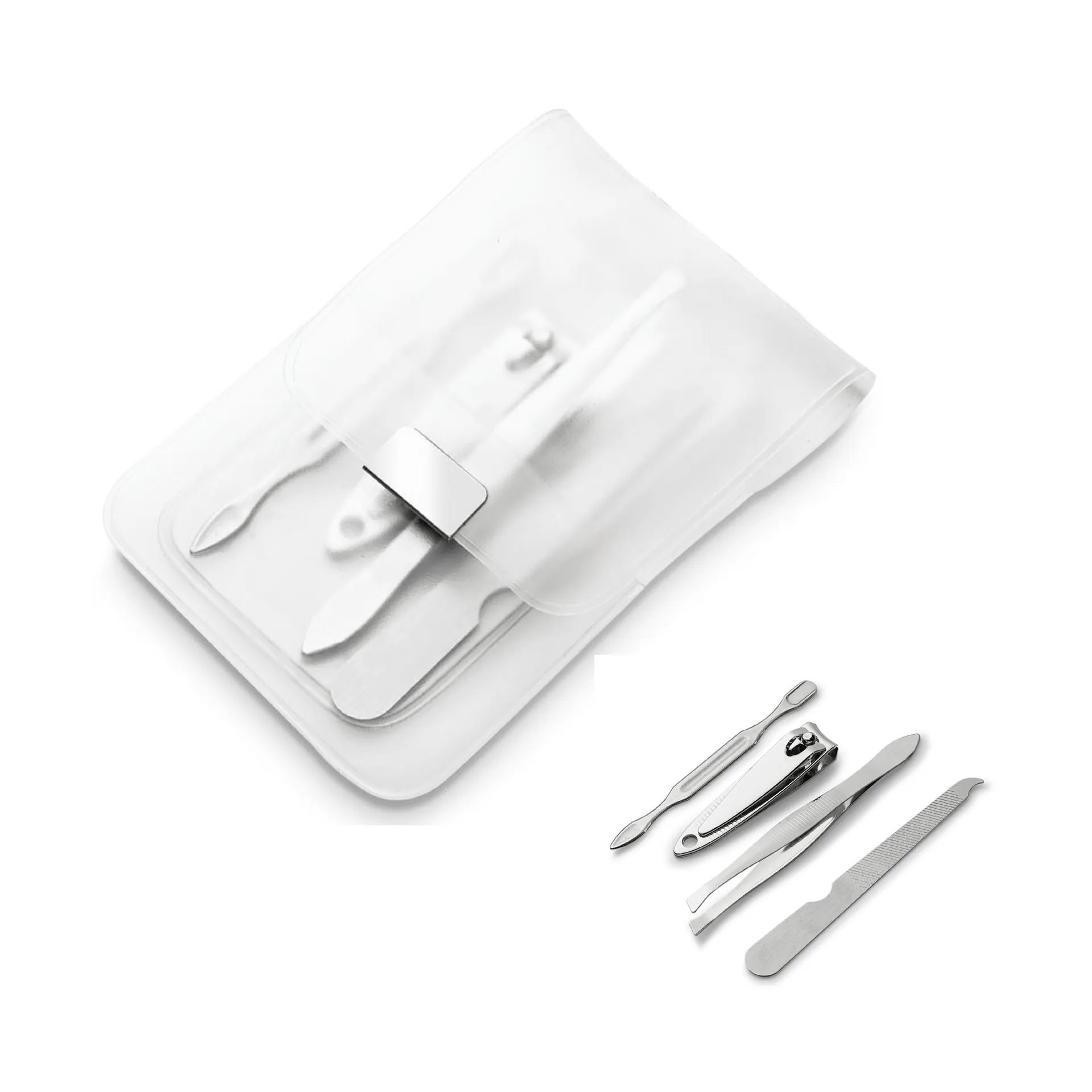 Set de manicura de 4 piezas. Contiene alicate, lima de uñas, repujador de cutículas y pinza de depilar . Incluye bolsa de PVC. Compacto. Medidas: 6,6x10,5 cm