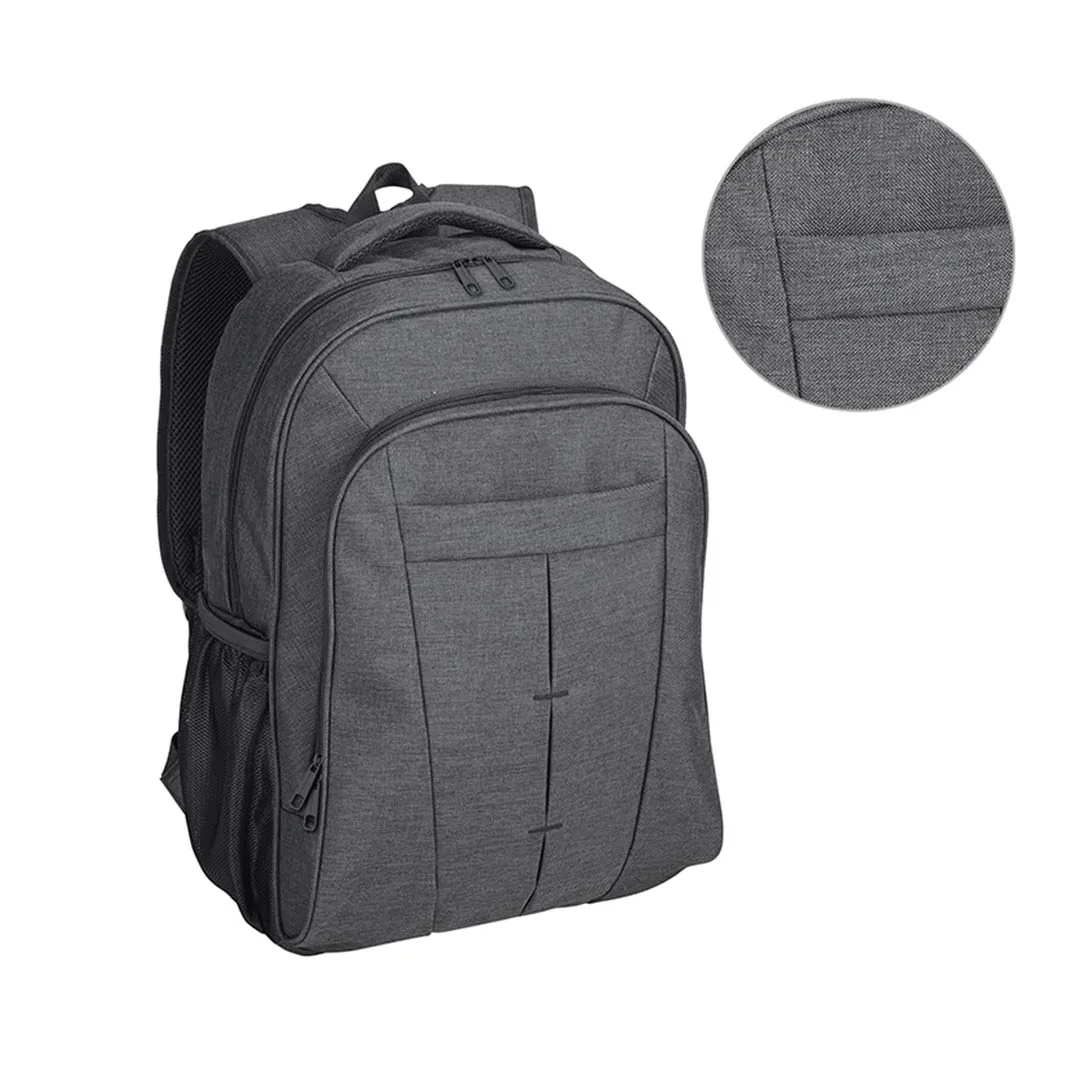 Mochila para notebook de hasta 17'', fabricada en poliéster 600D de alta densidad. Compartimiento principal forrado, con cierre, divisor acolchado y varios bolsillos interiores. Dos bolsillos laterales de red y dos bolsillos frontales. Tiras y espalda acolchadas. Capacidad de hasta 24 L.
