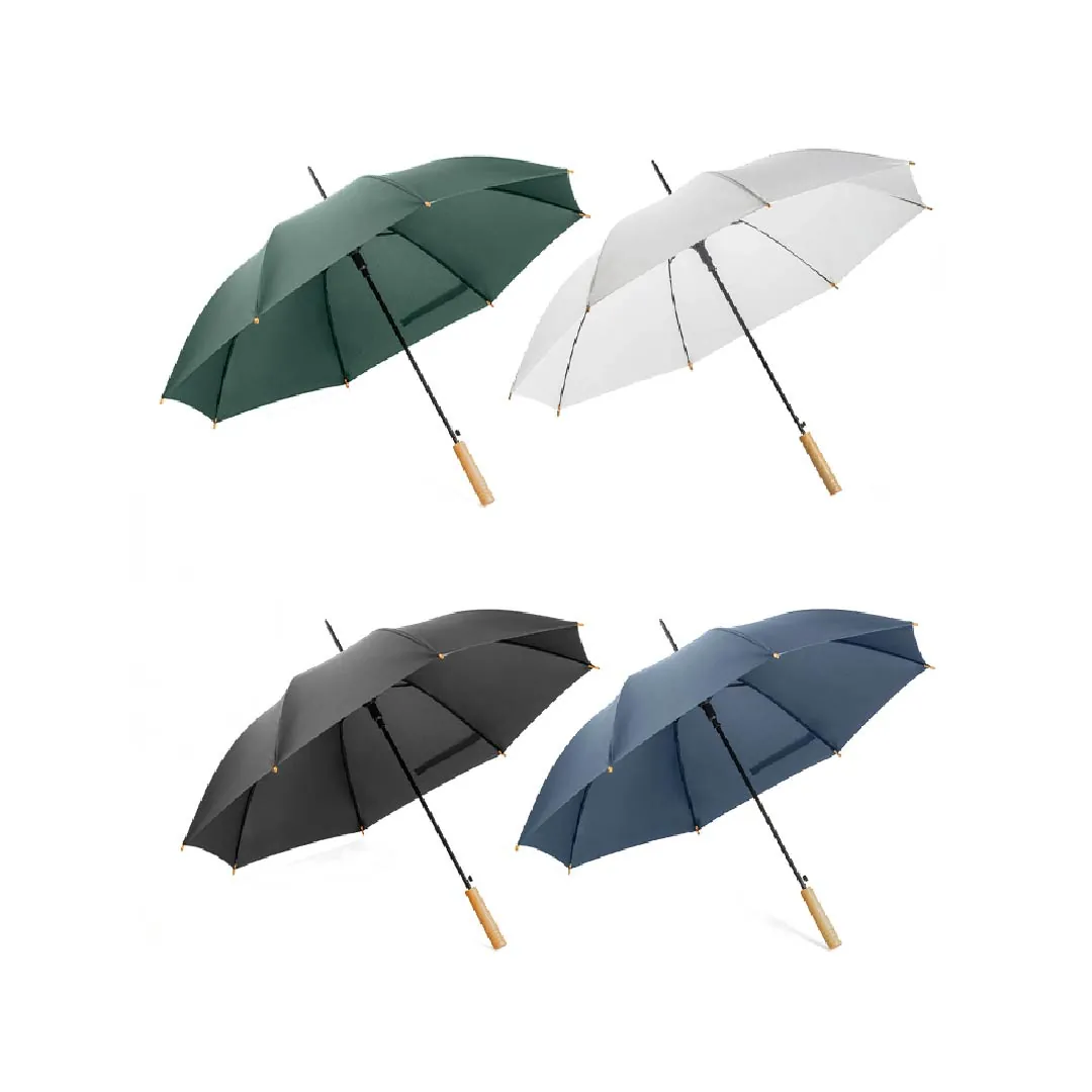 Paraguas de 8 gajos con tela impermeable de rPet (plástico reciclado). Con mango de madera, y estructura y puntera metálicas. Con mecanismo de apertura automática.Medidas: Diámetro 105 cm, Largo 85 cm