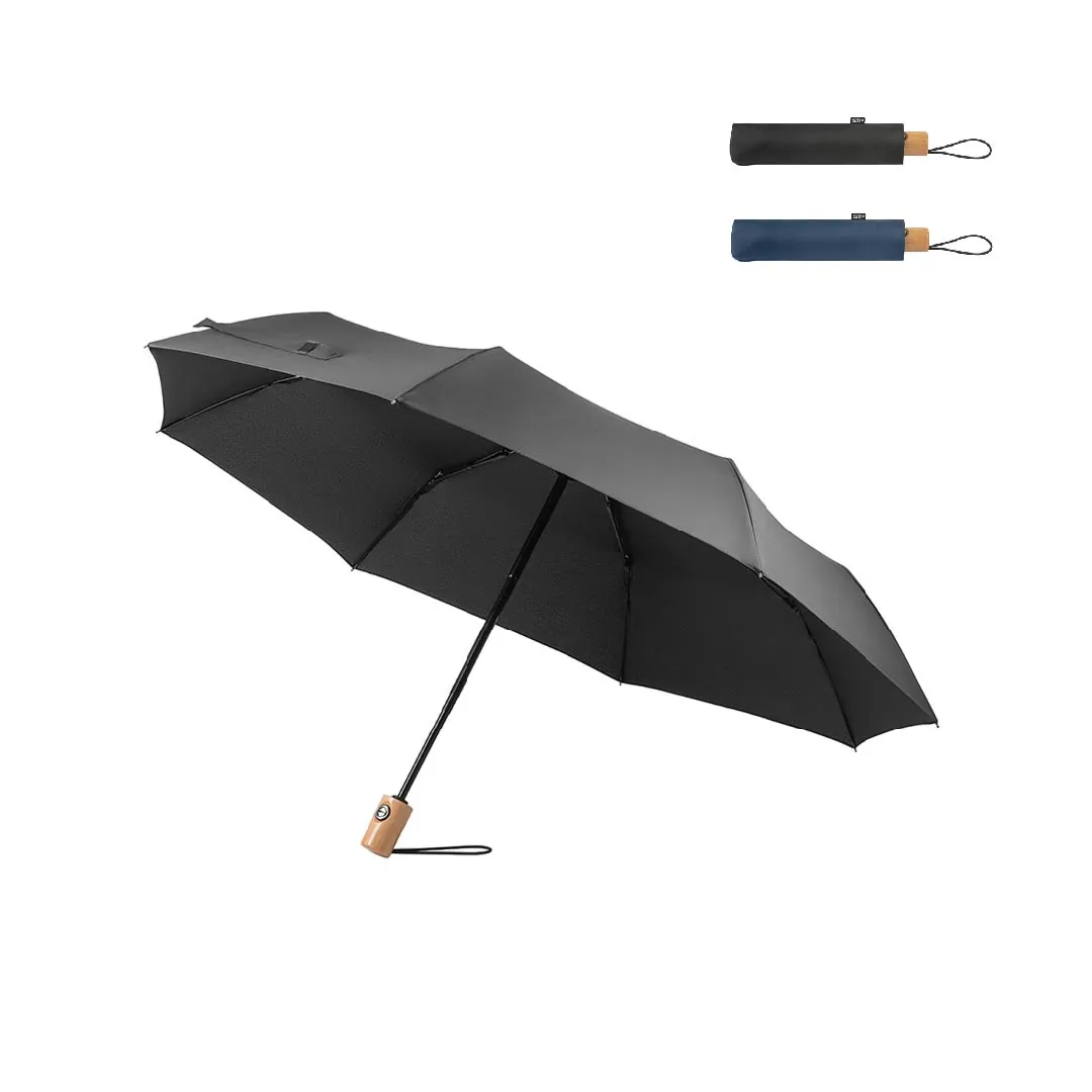 Paraguas con tela impermeable 100% confeccionada con rPET (plástico reciclado), con varillas de fibra de vidrio y mango de madera con elástico para colgar. Se pliega en 3 secciones y es resistente al viento. Cuenta con apertura y cierre automático. Trae funda a color con etiqueta "rPet".