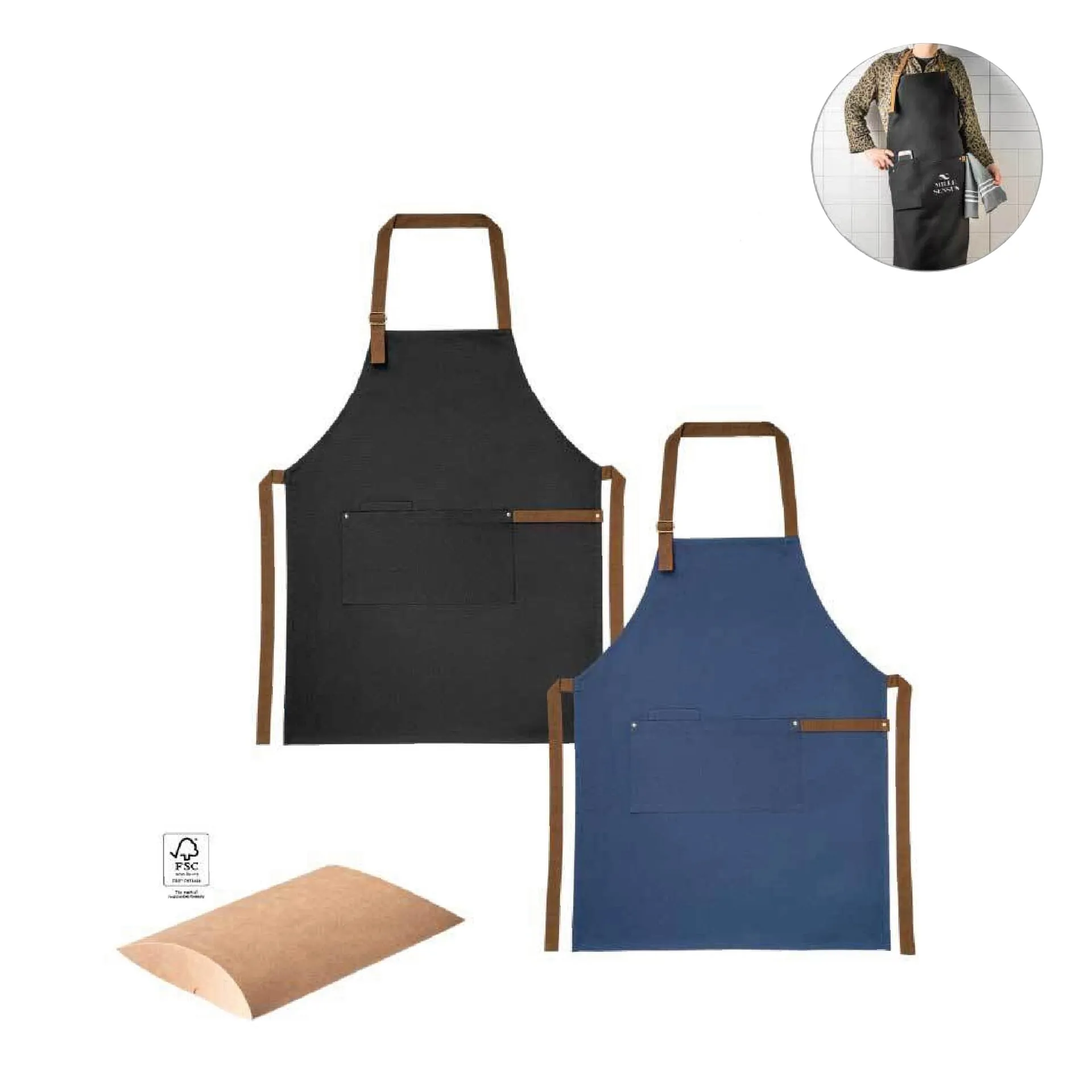 Delantal fabricado en lona 100% algodón (300 g/m²) con detalles metálicos. Cuenta con 3 bolsillos multifuncionales + tira lateral. Tiene una cinta que se ajusta al cuello. Incluye packaging de caja kraft de material certificado FSC™. Medidas: 68 x 90 cm | Caja: 24 x 32 x 7 cm