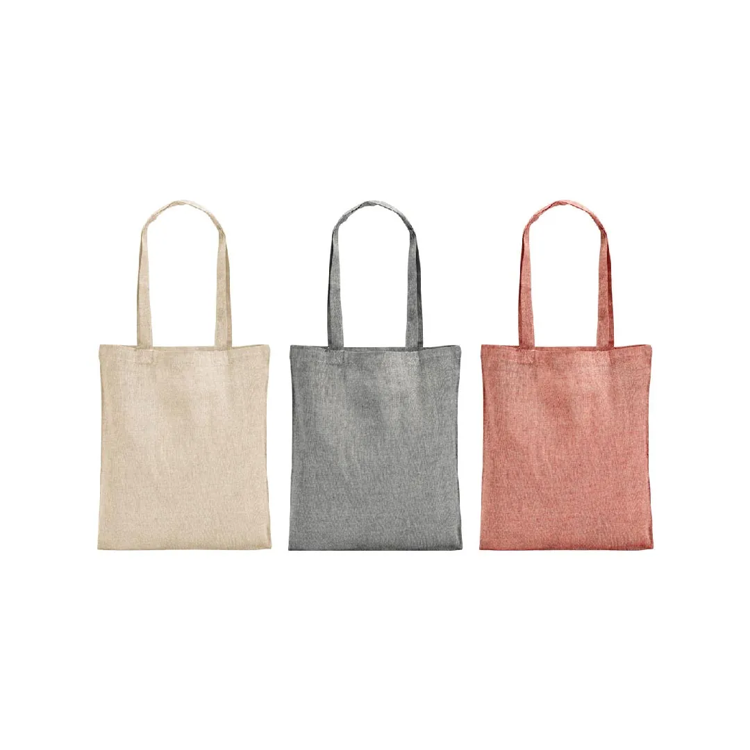 Bolsa de 38x42 cm hecha con 70% algodón reciclado y 30% poliéster rPET (140 g/m²). Incluye asas de 60 cm. Fabricada con materiales reciclados, ideal para un uso responsable y sostenible.